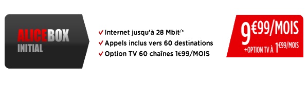 L’offre Alice Box Initial est au tarif de 9.99€ et nécessite l’abonnement France Telecom de 16€. Il est possible sinon de choisir l’option de mise à disposition de la boucle locale dédiée à 9,99€ par mois et Alice devient votre opérateur téléphonique unique soit 19.98€ au total par mois.