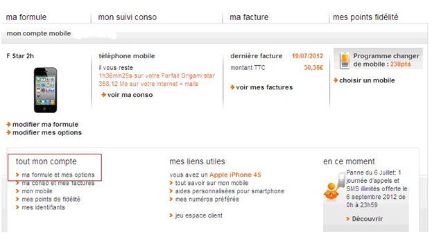 - En allant sur orange.fr dans votre espace client : tout mon compte > ma formule et mes options