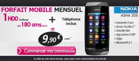 Le mobile fourni dans l’offre est le Nokia ASHA 305, un nouveau modèle très design avec la possibilité d’insérer 2 cartes Sim (Dual Sim). Ce téléphone portable embarque un appareil photo de 2 megapixels, un écran tactile 3'', la radio et intègre la connectivité Bluetooth 2.1. Ce téléphone bénéficie d’une garantie constructeur de 2 ans.