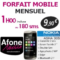 Afone Mobile qui utilise le réseau SFR propose le forfait mobile mensuel depuis avril 2010 et la particularité de cette offre, c’est de bénéficier d’un mobile de grande marque avec l'abonnement. Depuis quelques jours, le modèle proposé a changé et c’est désormais le Nokia ASHA 305 qui est fourni.