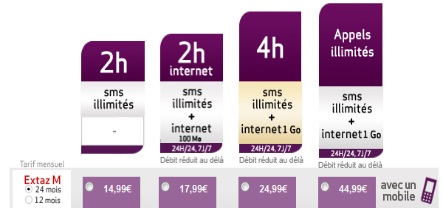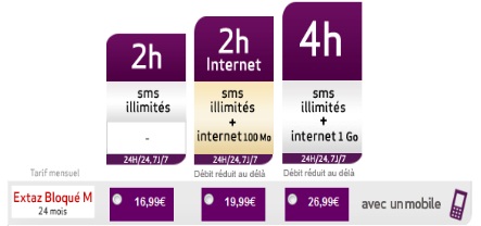 Le forfait bloqué 4h Extaz M à 26.99€ comprend 4h de communication par mois ainsi que les sms illimités et un accès internet de 1Go (débit réduit au-delà).