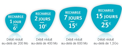 La recharge 6€ valable 1 jour, débit réduit au-delà de 200Mo.