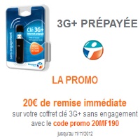 Bouygues Telecom propose une remise immédiate de 20€ sur l’achat de la clé 3G+ jusqu’au 11 novembre prochain. La clé 3G+ ZTE MF190 sans engagement est au tarif de 39€ soit 19€ avec la réduction. Pour bénéficier de la remise immédiate, vous devez vous inscrire à l’offre clé 3G+ sans engagement et indiquer lors de l’inscription le code promo « 20MF190 ».