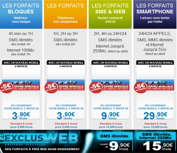 Le forfait 5h disparait et un nouveau forfait est intégré à la gamme : le forfait 4h avec sms illimités et un accès Internet de 250Mo facturé 24.90€ sur 24 mois ou 12 mois avec achat de mobile et à partir de 17.90€ sans mobile. Le forfait 2h sms illimités et un accès Internet 100Mo reste au même prix. Le forfait 24h/24 baisse de prix et passe à 34.90€ au lieu 37.90€.