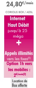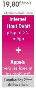 L’offre Coriolis Box Adsl Seul au prix de 19.80€ intègre une connexion à internet jusqu’à 25Méga ainsi que la possibilité d’appeler vers les fixes et mobiles selon les tarifs en vigueur. Avec cette offre, vous n’avez plus besoin de payer l’abonnement France Telecom soit une économie de 192€/an.