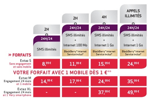 Le forfait Extaz S 4h sera à 15.99€/mois au lieu de 18.99€/mois avec 4h de communication par mois ainsi que les sms illimités ainsi qu’un accès Internet avec un volume de 1Go.