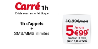 Le forfait carré 1h00 est à 5.99€/mois pendant 12 mois au lieu de 10.99€/mois sur un engagement de 12 mois sans mobile. Il se compose de 1h00 d'appel + des SMS/MMS illimités + du Services Carré Silver (renouvellement de mobile tous les 24 mois, vous avez 15 jours pour essayer et échanger votre mobile, prêt d’un mobile en cas de problème).