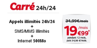 Le forfait carré 24h/24 est à 19.99€/mois pendant 1 an au lieu de 34.99€/mois sur un engagement de 12 mois sans mobile. Cet abonnement contient les appels illimités vers tous les opérateurs mobiles et fixes en France métropolitaine + les SMS/MMS illimités vers tous les opérateurs en France métropolitaine + Internet, mails et vidéo jusqu'à 500 Mo inclus (rechargeables) sur le réseau 3G+ ainsi que le Service Carré Silver (renouvellement de mobile tous les 24 mois, vous avez 15 jours pour essayer et échanger votre mobile, prêt d’un mobile en cas de problème).