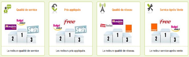 Budget Mobile obtient la première place du podium, rappelons que ce denier propose de nombreux forfaits mobiles à partir de 1.99€ par mois avec les appels vers plus de 77 pays décomptés des forfais classiques 30 min, 2h et 4h. Free Mobile se place en deuxième position proposant des offres mobiles à partir de 2€ par mois avec 1h d’appel et 60 sms et un forfait illimité à 19.99€. Sur la dernière marche du podium on retrouve Zero Forfait qui propose des offres mobiles à partir de 1.99€ avec l’offre au compteur et un forfait illimité à 14.99€.