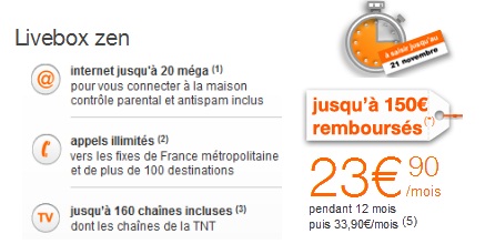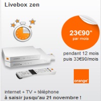 Orange propose l’offre LiveBox Zen en promotion du 08 au 21 novembre prochain pendant 12 mois. L’abonnement est au tarif de 23.90€ au lieu de 33.90€ sans l’abonnement France Telecom et 18.90€ au lieu de 28.90€ en conservant l’abonnement téléphonique. De plus, Orange vous offre 50€ si vous êtes client Orange mobile, et jusqu’à 100€ sur vos frais de résiliation dans le cadre d’un changement de FAI.