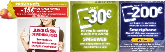 Vous profitez également d’un remboursement jusqu’à 200€ avec la souscription simultanée à un forfait smartphone et jusqu’à 30€ avec la souscription à un forfait SMS et Web avec un engagement de 24 mois jusqu’au 13 janvier 2013.