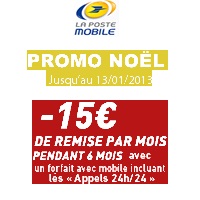 La Poste Mobile qui utilise le réseau SFR a changé ses offres mobiles le 15 octobre dernier en modifiant sa gamme des forfaits mobiles incluant les appels illimités. Pour Noël, l’opérateur propose une remise exceptionnelle de 15€ pendant 6 mois sur le prix des forfaits avec appels illimités et l’achat de mobile avec un engagement de 12 ou 24 mois.