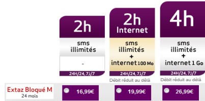 Le forfait Extaz M boqué 4h + internet est au tarif de 26.99€ avec un engagement de 24 mois avec 4h de communication par mois ainsi que les sms illimités et accès internet de 1Go.
