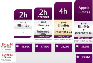 Le forfait Extaz M appels illimités est au tarif de 35.99€ avec un engagement de 24 mois et 45.99e sur 12 mois avec appels illimités ainsi que les sms illimités et accès internet de 1Go.
