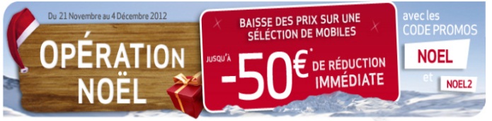 Virgin Mobile, MVNO qui utilise le réseau de l’opérateur SFR, lance une opération Noël du 21 novembre au 04 décembre 2012. En effet, vous profitez d’une baisse de prix sur une sélection de mobiles jusqu’à 50€ de réduction immédiate. Pour profiter de la remise, vous devez lors de l’inscription indiquer le code promo NOEL ou NOEL2 en fonction du modèle avec la souscription simultanée à un forfait Extaz Mbloqué ou non avec un engagement de 12 ou 24 mois.