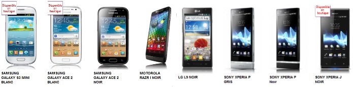 Le code de réduction « NOEL» pour le Samsung Galaxy S3 mini blanc, Samsung Galaxy Ace 2 noir ou blanc, Sony Xperia P gris ou noir, Motorola Razr i, LG L9 et le code de réduction «NOEL2» pour le Sony Xperia J.