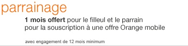 Cette offre de parrainage est limitée à un remboursement par filleul souscrivant à un forfait mobile Orange avec engagement minimal de 12 mois (hors offres Orange Open et forfaits open multilignes). Le parrain doit disposer depuis plus de 3 mois d’un forfait mobile Orange avec engagement minimal de 12 mois (hors offres Orange Open et forfaits open multilignes). Un même parrain ne peut parrainer qu’un filleul sur une période de 12 mois. Le remboursement se fera sous forme d’avoir sur facture pour le mois de parrainage offert.