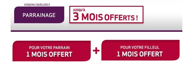L’offre de parrainage est de retour chez Virgin Mobile jusqu’au 29 janvier 2013, vous pouvez gagnez jusqu’à 3 mois offerts. Cette offre est valable sur tous les forfaits avec engagements et forfaits bloqués et l'auto-parrainage est possible : cela permet à un même payeur d'être parrain d'une autre ligne.