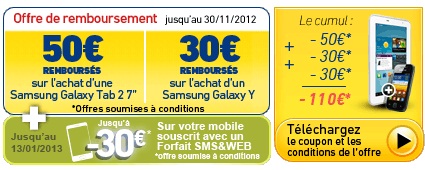 De plus pour la période des fêtes, La Poste Mobile vous rembourse jusqu’à 200€ pour l’achat de votre mobile avec la souscription simultanée à un forfait Smartphone 3Go ou 5Go et jusqu’à 100€ sur le forfait Smartphone 1Go et 30€ pour la souscription à un forfait SMS et Web avec un engagement de 24 mois. Vous profitez également d’une remise de 15€ pendant 6 mois sur tous les forfaits avec appels illimités. Le constructeur Samsung vous rembourse jusqu’à 50€ pour l’achat d’une Galaxy Tab 2 et jusqu’à 30€ pour l’achat du Samsung Galaxy Y jusqu’au 30 novembre 2012.