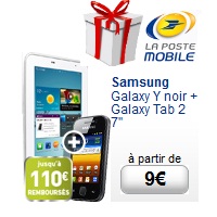 La Poste Mobile propose un pack cadeau mobile et tablette pour la période de fêtes. Le Samsung Galaxy Y vous est livré avec une Galaxy Tab 2 7', à partir de 79€ avec un forfait SMS et Web avec un engagement de 24mois et à partir de 9€ avec un forfait Smartphone 24h/24.