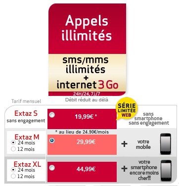 Le forfait Extaz S sans engagement est au tarif de 19.99€ en exclu Web et intègre les appels (199correspondants différents par mois et 3hmax/appel), sms et mms illimités et un accès Internet avec un volume de 3Go par mois au delà débit réduit.
