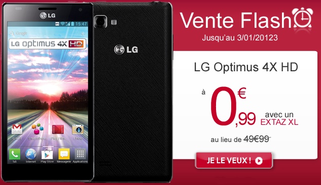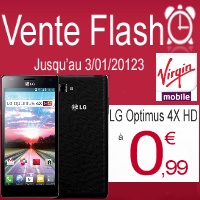 En ce dernier jour de l'année, Virgin Mobile a décidé de vous faire profiter d'une dernière promotion exceptionnelle : 49€ de remise immédiate sur l’achat de votre Smartphone LG Optimus 4X HD. Il est proposé à partir de 0,99€ jusqu’au 03/01/13.