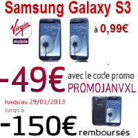 Et pour la période des soldes, Virgin Mobile vous offre 49€ de remise immédiate pour l’achat du Galaxy S3 du 09 au 22 janvier prochain en indiquant le code promo « PROMOJANVXL » avec un forfait Extaz XL. Le mobile vous revient donc à 150.99€ à la commande et 0.99€ avec la remise différée.
