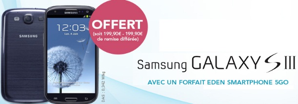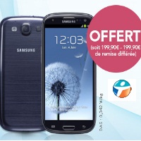 Bouygues Telecom propose le Samsung Galaxy S3 à 49.90euros jusqu’au 10 février prochain et 0€ jusqu'au 13 janvier prochain pour toute souscription à un forfait Eden Smartphone 5Go avec un engagement de 12 mois minimum. Ce Smartphone dernier cri est facturé 199.90€ à la commande et grâce au remboursement différé de 199.90€ (150€ +50€), le mobile vous revient à 0€.