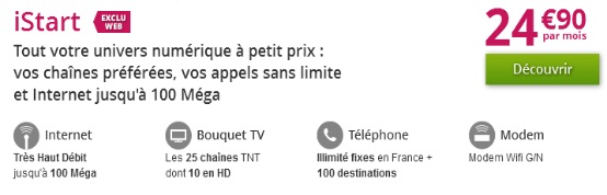 L’offre iStar à 24.90€ par mois comprend un accès Internet Haut débit jusqu’à 100Méga, la TV avec les chaînes de la TNT ainsi que les appels illimités vers les fixes en France et 100 destinations internationales.