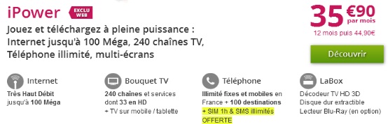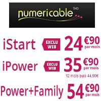 L’offre iPower à 35.90€ par mois pendant 12 mois puis 44.90€ comprend un accès Internet très Haut débit jusqu’à 100Méga ainsi que la TV avec 240 chaînes, disponible également sur le mobile ou Tablette et le multi Ecran. Vous profitez également des appels illimités vers les fixes et mobiles en France et vers les fixes de 100 destinations. Numericable vous offre également avec cette offre une carte sim avec 1h d’appels et sms illimités.