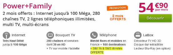 L’offre Power Family à 54.90€ comprend un accès Internet très Haut débit jusqu’à 100Méga ainsi que la TV avec 280 chaînes, disponible également sur le mobile ou Tablette et le multi Ecran. Vous profitez également de 2 lignes téléphoniques avec les appels illimités vers les fixes et mobiles en France et vers les fixes de 100 destinations. Numericable vous offre également avec cette offre une carte sim avec 1h d’appels et sms illimités.