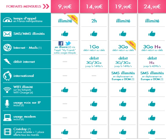 - Le forfait 24h/7 est proposé à 9.90€ avec les appels illimités vers les fixes et les mobiles en France, ainsi que les SMS et MMS illimités et un accès aux réseaux sociaux (Facebook, Twitter..)en illimité.