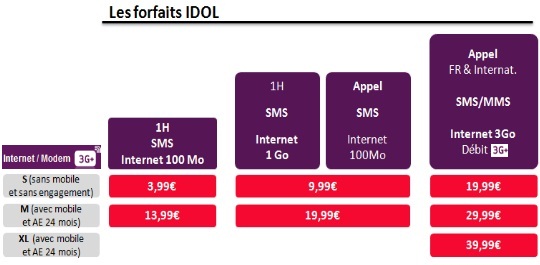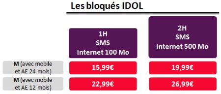 Le forfait bloqué IDOL M 1h + 100Mo comprend 1h d ‘appels ainsi que les SMS illimités et un accès Internet de 100Mo (au-délà 0.05€/mo) au prix de 15.99€ sur 24 mois, disponible sur 12 mois à 22.99€.