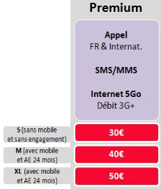 Le forfait Premium intègre les appels illimités vers les fixes et les mobiles en France ainsi que les fixes d’Europe, Suisse et Andorre et les fixes et mobiles des DOM et Amérique du Nord, les SMS/MMS illimités en France ainsi qu’un accès Internet avec un volume de 5Go (au-délà débit réduit)par mois.