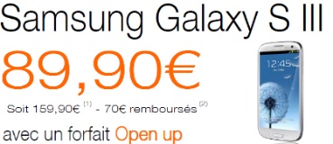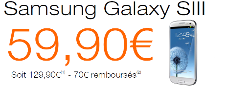 Le Galaxy SIII est facturé 129.90€ à la commande soit 59.90€ avec le remboursement différé en souscrivant au :