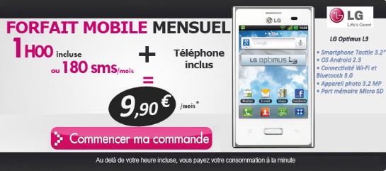 Le forfait mensuel intègre 1h d’appel par mois ou 180 sms au prix de 9.90€ avec un engagement de 12 mois. Le prix d’un sms dans le forfait correspond à 20 secondes de communication voix. Si vous dépassez votre forfait, la minute en hors forfait est à 0.165€ par minute et 0.090€ par envoi de sms.