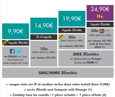 - Forfait 24/7 avec Appels illimités, SMS, MMS illimités, accès Facebook et Twitter en illimité à 9,90€/mois,