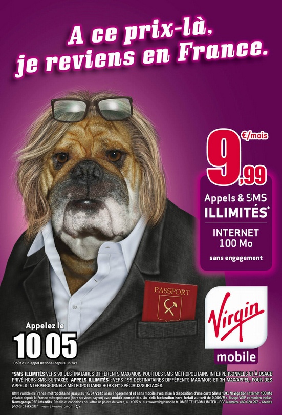 La semaine dernière, Virgin Mobile a mis en place de nouvelles offres et simplifié sa gamme. L’opérateur mobile n’en reste pas là et lance une nouvelle campagne de publicité qui va faire parler. Il met en scène des chiens déguisés en Gérard Depardieu ou Mickael Jackson entre autres.