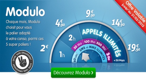 Le forfait Modulo est un forfait sans engagement avec la possibilité de bénéficier d’un téléphone neuf ou reconditionné, payable comptant ou avec financement en quatre fois sans frais, au meilleur prix du marché.