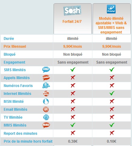 Vous hésitez parmi les forfaits illimités Low Cost sans engagement proposés par les différents opérateurs mobiles. Edcom a décidé de détailler pour vous le forfait illimité de Sosh et le forfait illimité de Prixtel . En effet, votre choix va dépendre dans un premier temps du prix du forfait et dans un second temps des services associés. Voici un tableau récapitulatif des 2 offres :