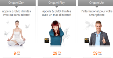 - Le forfait Origami Play 24/7 3G 4Go comprend les mêmes services que le précédent avec en plus les appels illimités vers les fixes de 100destinations ainsi qu’un accès Internet de 4Go en 3G+ (débit réduit au-delà. Disponible à partir de 59.90€ sur 24 mois et en version Sim Origami Play 24/7 3G Sim (offre sans mobile) à 44.90€ sur 12 mois.