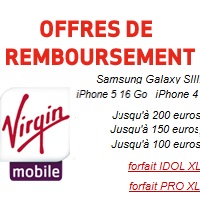 Virgin Mobile a prolongé les offres de remboursements pour l’achat de l’iPhone 5, l’iPhone 4 et le Samsung Galaxy S3. Il ne vous reste donc plus que quelques jours pour profiter des remises jusqu’à 200€ pour l’achat d’un iPhone 5 et Galaxy S3 et jusqu’à 100€ pour l’achat d’un iPhone 4 avec la souscription à un forfait iDOL Pro XL avec un engagement de 24mois. Les offres de remboursements sont valables jusqu’au 16 avril prochain. Voici le détail des remises et forfaits associés pour bénéficier des remises sur les mobiles.