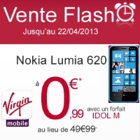 Virgin Mobile vous propose dès aujourd’hui et jusqu’au 22 avril de profiter d’une remise exceptionnelle pour l’achat d’un téléphone mobile Nokia Lumia 620 et la souscription d’un forfait IDOL M ou forfait bloqué IDOL M.