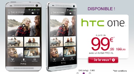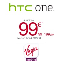 Le HTC One est disponible chez Virgin Mobile, ce dernier est proposé à partir de 99.99€ avec un forfait Pro XL. En effet, pour l’achat de ce modèle avec la souscription simultanée à un forfait PRO XL avec un engagement de 24 mois, Virgin Mobile vous rembourse jusqu’ à 100€ jusqu’au 18 juin 2013 soit à régler à la commande 199.99€. Le remboursement ne pourra excéder le prix de vente du mobile acheté. Pour en bénéficier, vous devrez vous inscrire sur www.virginmobile.fr dans un délai de 30 jours suivant l’activation de la ligne et le remboursement se fera sous réserve du paiement des deux premières factures.