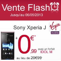 Virgin Mobile vous propose dès aujourd’hui et jusqu’au 6 Mai de profiter d’une remise exceptionnelle de 29 € pour l’achat d’un téléphone mobile Sony Xperia J et la souscription d’un forfait IDOL M ou forfait bloqué IDOL M.
