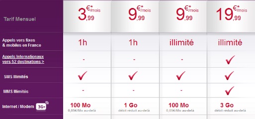 - Le forfait IDOL S 1h SMS + 100Mo comprend 1h d’appels ainsi que les SMS illimités et un accès Internet de 100Mo (au-delà 0.05€/mo) au prix de 3.99€.