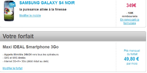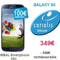 L’opérateur Coriolis qui utilise le réseau de l’opérateur SFR propose depuis le 13 mai le Galaxy S4. Ce dernier est au prix de 249€ avec un forfait Ideal Smartphone à partir de 49.80€ avec un engagement de 24 mois. En effet, Coriolis vous offre jusqu’à 100€ pour l’achat de ce mobile du 29 avril au 31 juillet 2013 avec la souscription simultanée à un forfait Ideal Smartphone 3Go.