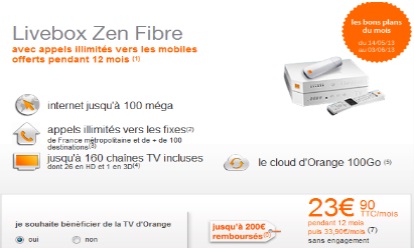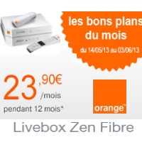 Orange offre 10€ de remise pendant 12 mois sur la Livebox Zen Fibre pour toute souscription entre le 14 mai et 03 juin prochain 2013. La formule Livebox Zen Fibreest donc au prix de 23.90€ au lieu de 33.90€. De plus, Orange vous fait bénéficier d’une promotion sur son offre Livebox Zen Fibre : les appels illimités vers les mobiles offerts pendant 1 an puis 5€ par mois.
