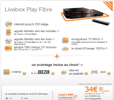 Orange offre 5€ de remise pendant 12 mois sur l’offre Livebox Play Fibre soit à 34.90€ au lieu de 39.90€. Cette promotion est réservée aux clients domiciliés dans un immeuble ou une maison individuelle éligible à la fibre depuis moins de 3 mois et souscrivant à une offre Livebox Play Fibre entre le 04/04/13 et le 12/06/13.