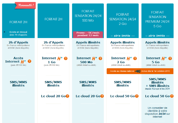 - Le forfait Sensation illimités 500Mo est au prix de 34.99€ avec achat de mobile et en version Sim offre sans mobile à 24.99€ sur 12 mois. Ce dernier comprend les appels illimités en France et vers les DOM, les SMS et MMS illimités et accès à internet en 3G+/H+ avec 500Mo au-débit réduit et le Cloud 20Go.